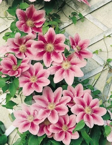Luscious, large, deep pink, early summer flowers with a darker pink stripe and mid-green leaves. This compact clematis is ideal for growing through a climbing rose or tree in partial shade. Although it may take time to establish it is well worth the wait, since it is a prolific flowerer.