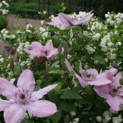 The delicate mauve-pink cup-shaped flowers with reddish-brown centres of ‘Hagley Hybrid’ can grow up to 10cm across from July to September. This vigorous, large flowered clematis is ideal for a north-facing site. A compact variety useful where space is limited, it is best in partial shade since the pretty flowers fade in strong sunlight. Combine with Rosa ‘Rambling Rector’ and Solanum crispum ‘Glasnevin’ for a vigorous swathe of climbing colour over large arbours and pergolas.