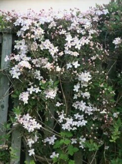 Sweetly scented, pink flowers in May and June amid purple-flushed, mid-green leaves. This vigorous, deciduous clematis is ideal for covering a wall or fence in sun or partial shade. Since it often outgrows the space intended for it, for a small garden we’d advise the less-vigorous Clematis montana var. rubens ‘Freda’.