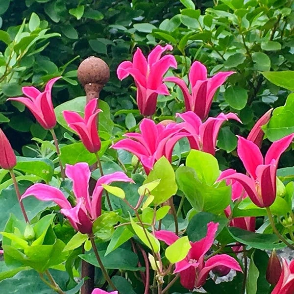 Striking, bright pink, trumpet-shaped flowers with prominent, creamy-yellow centres from August to October and mid-green leaves. This late-flowering clematis looks lovely scrambling through a climbing rose or tree in full sun or semi-shade. The unusual, tulip-like flowers associate well with many medium-sized garden shrubs.