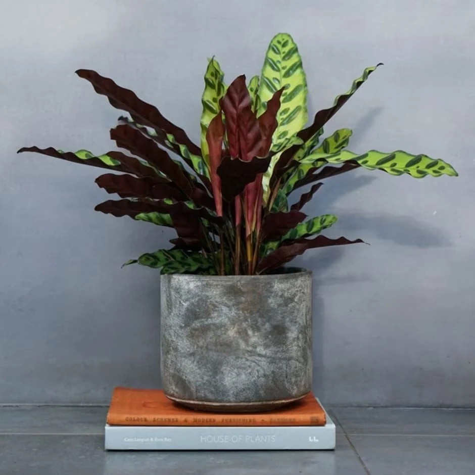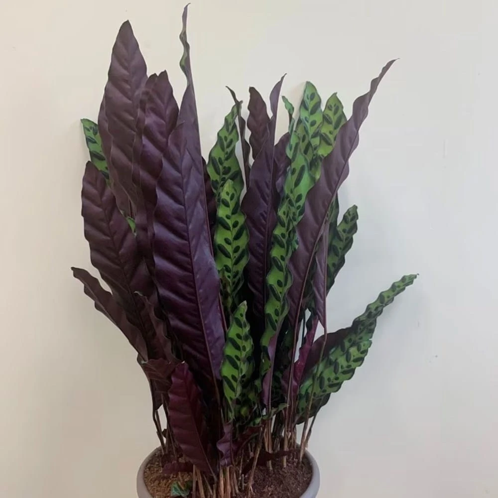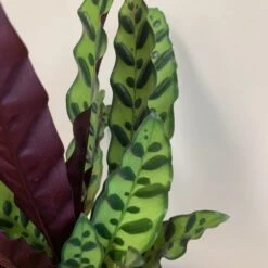 The upper leaf surface of this attractive house plant is a lush-looking mix of apple green and rich forest green, while the underneath is a contrasting magenta-purple. This becomes more noticeable in low light levels when the leaves fold up on themselves, and become more upright.