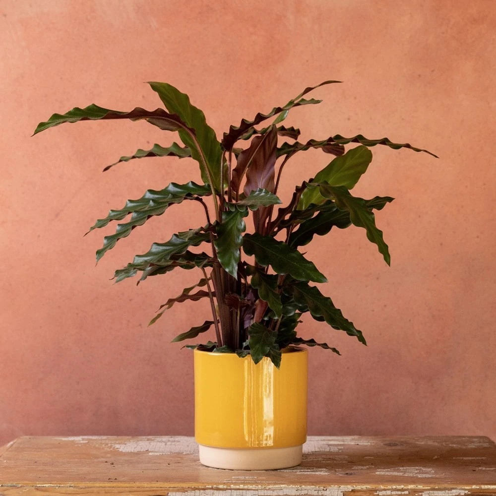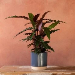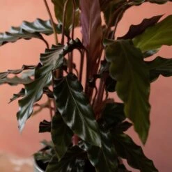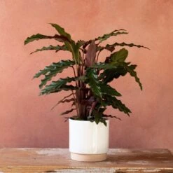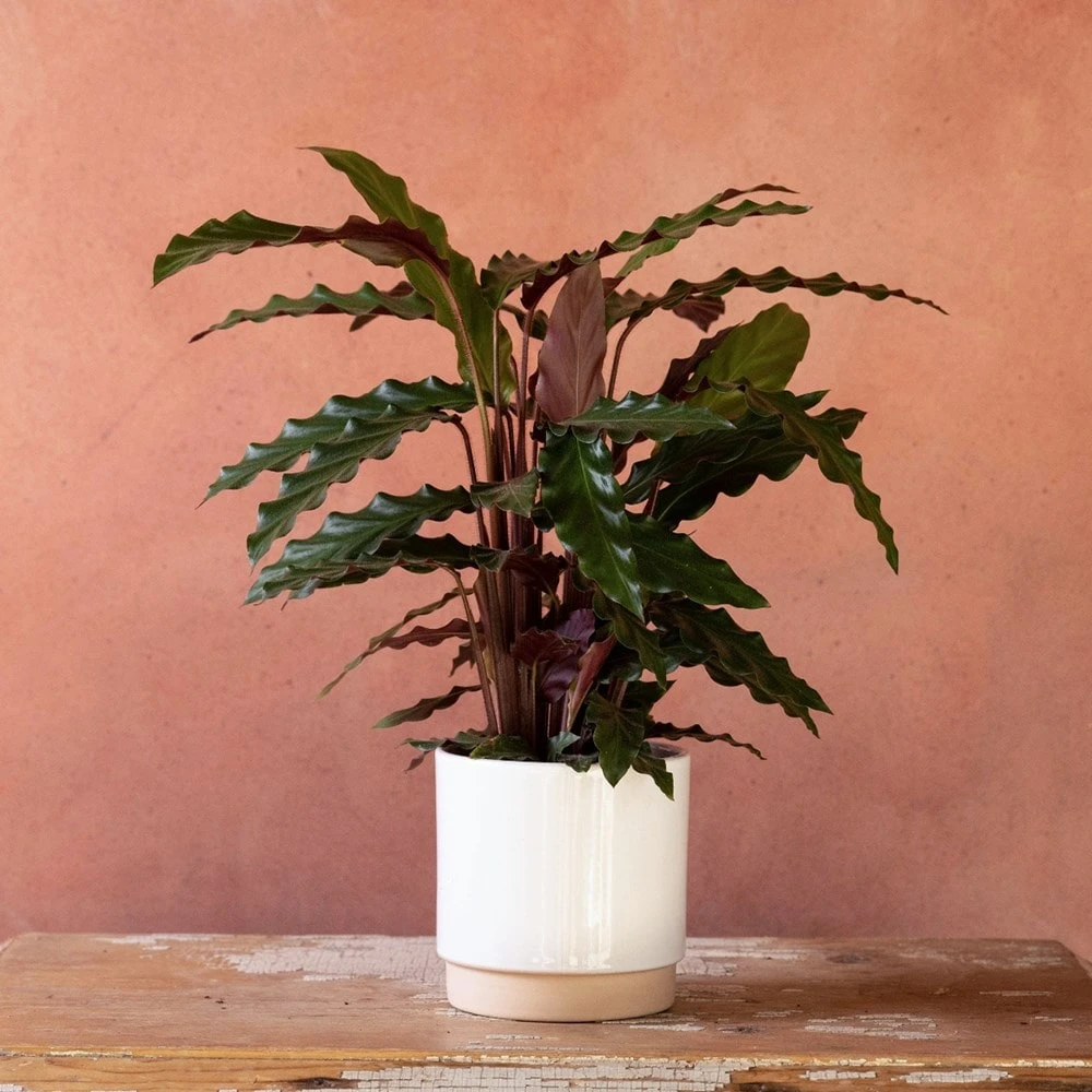 This prayer plant has narrow, glossy, dark-green, lance-shaped leaves, with velvety-maroon undersides and a charming ruffled appearance. Upright in habit, this houseplant would provide a great vertical accent and has the potential to complement many interior decor styles.