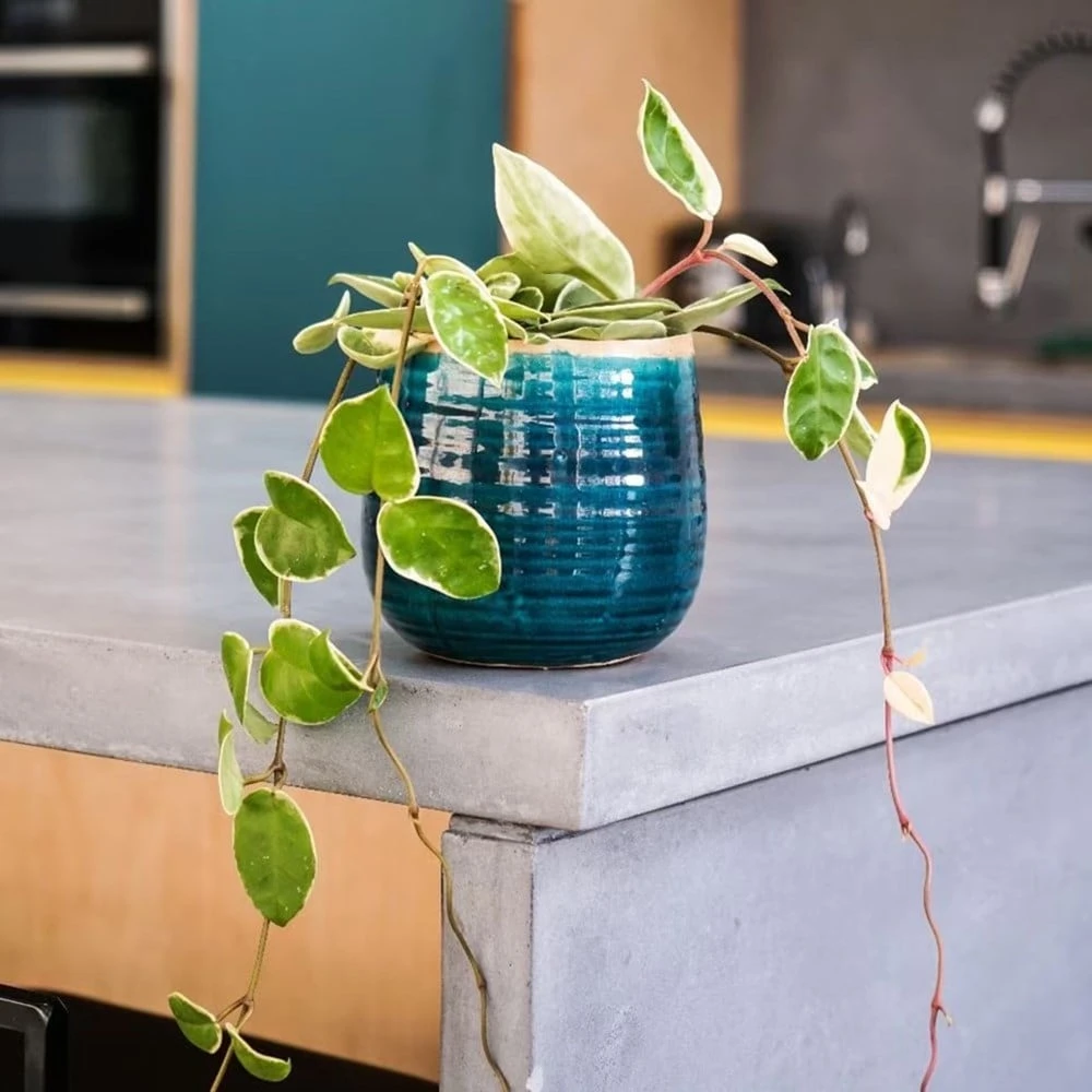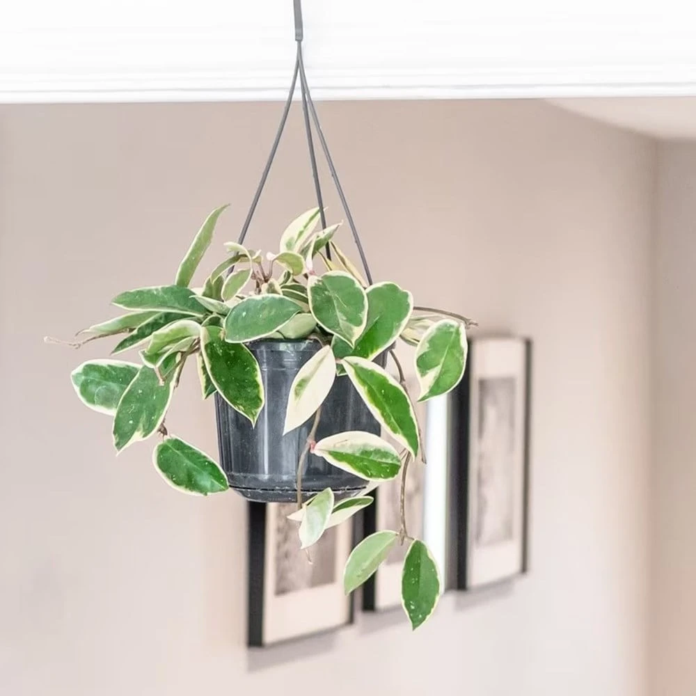 Cream and green variegated foliage, which has a fleshy texture, forms along the length of the lax stems of this beautiful climber. In time, domed clusters of waxy pink flowers may also appear, and these usually emit a sweet perfume in the evening. The plant is sent out without any flowers, but it looks great popped into a decorative pot cover and placed on a shelf. Alternatively, you could repot it into a hanging basket and let the stems cascade.