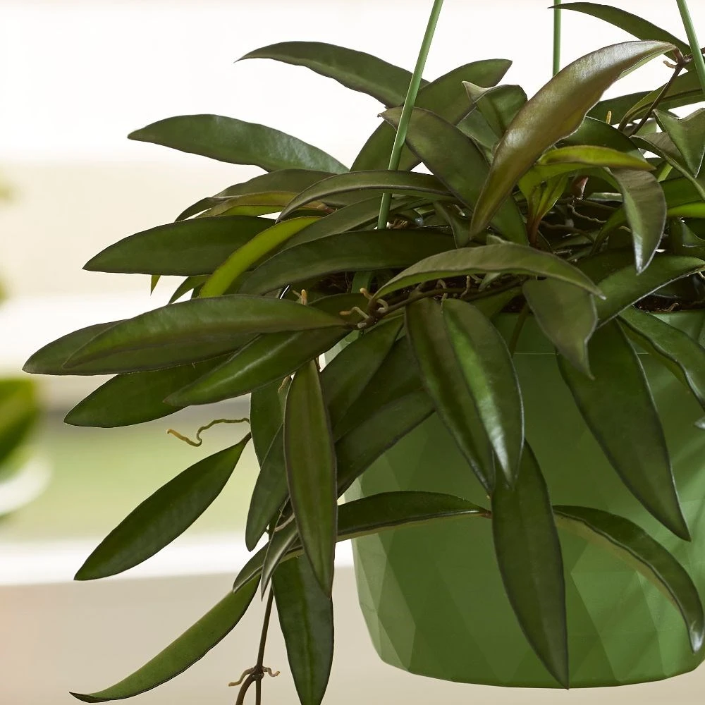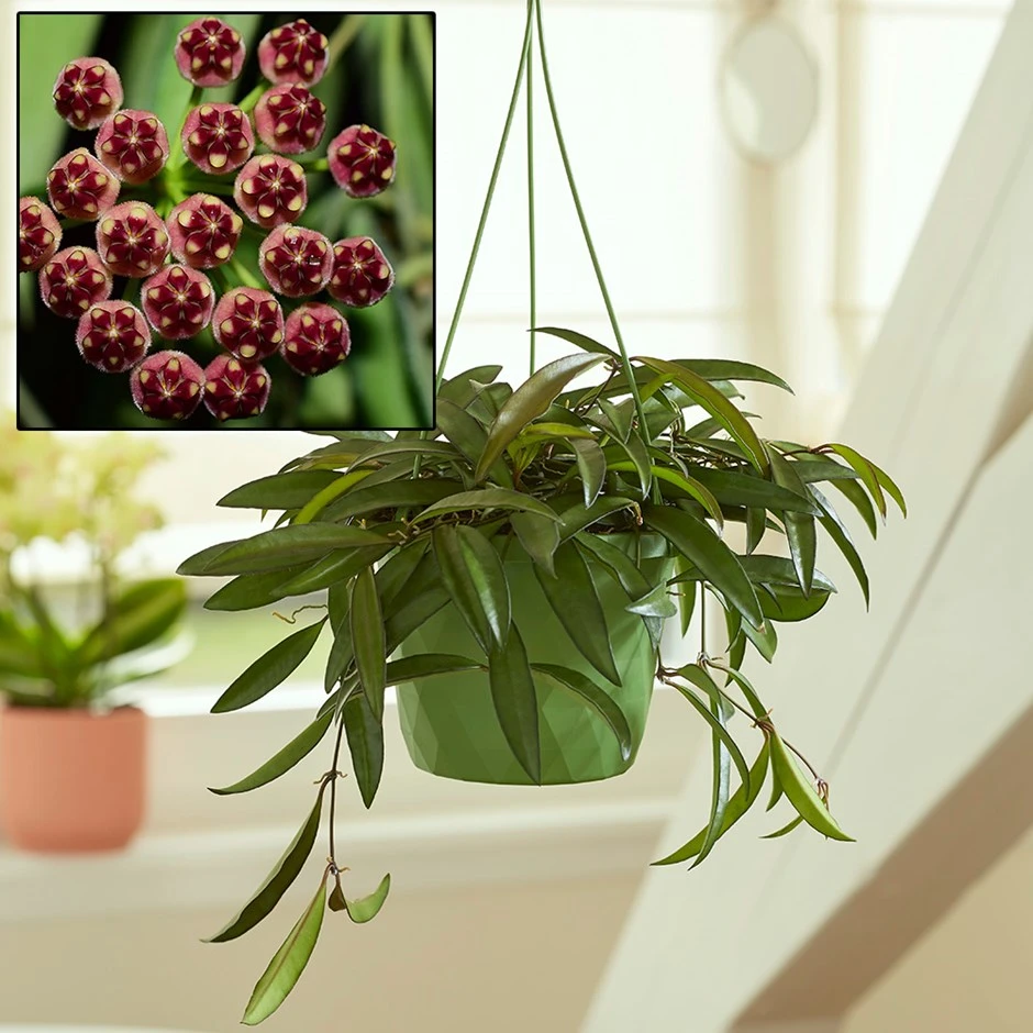 Hailed as one of the easier hoyas to grow, the foliage of this handsome house plant is a rich green, but each leaf often has a fine brown edge. Then, given the right conditions, it may start to flower, producing scented clusters of burgundy-pink blooms on its trailing stems. Please note however that it will not be sent out in bloom.