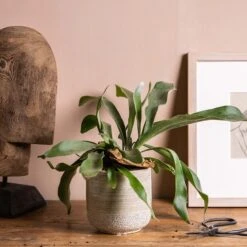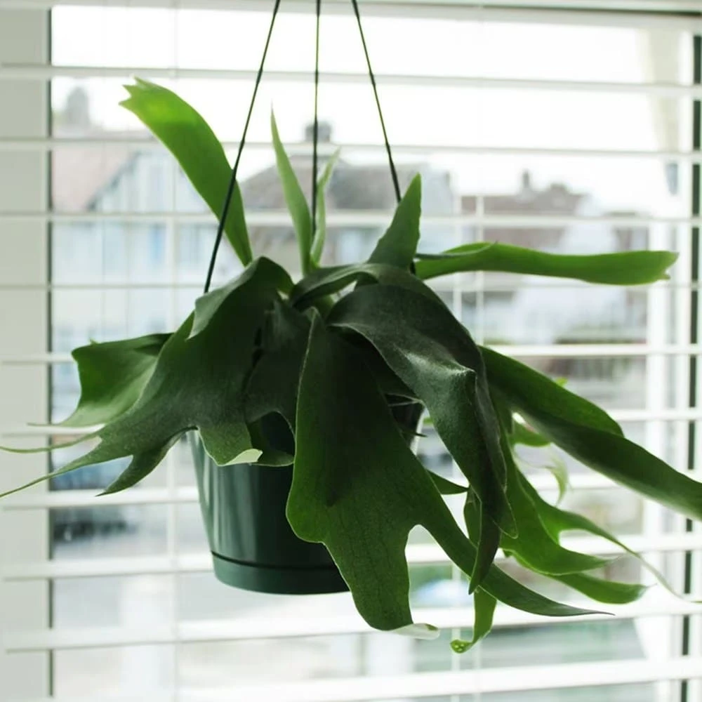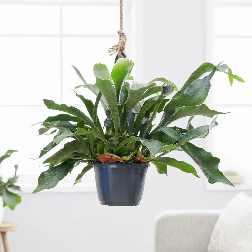 In its natural environment, this unusual (epiphytic) fern would usually be found attached to the branches or stem of a tree, but these ones have been potted up into hanging baskets so they can easily be displayed in the home. The combination of their flattened sterile fronds and gently arching, elkhorn-like fertile fronds is both dramatic and elegant – and will help to bring a tropical feel to the display.
