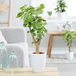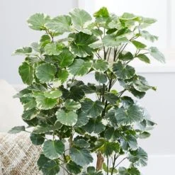 The rounded, lobed leaves of this striking house plant look a little like a geranium, but they have a leathery texture and an irregular creamy variegation. An excellent and unusual addition to the collection, it is mainly grown for its foliage, but every so often it may also produce airy sprays of greenish-yellow flowers.