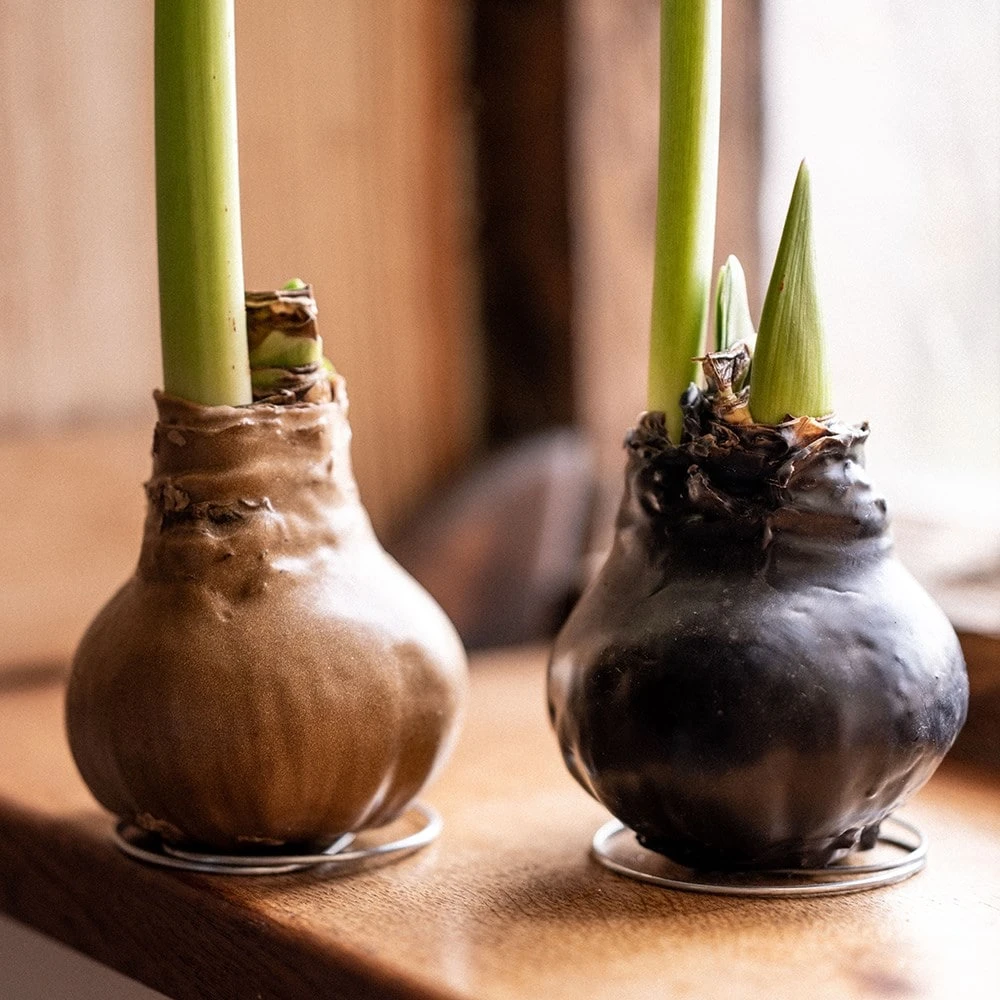 Waxed amaryllis bulbs are incredibly easy care houseplants, perfect for beginners and children. The bulbs arrive pre-planted on wire stands, ready to grow and bloom. Simply unpack and place in a cool, bright room. Over 3-6 weeks, thick stems will emerge and produce clusters of large, trumpet-shaped orange-red blooms. With no watering required, waxed amaryllis are a foolproof way to enjoy huge flowers in winter. Just open, display, and watch them grow and bloom!